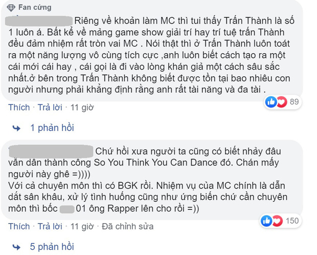 Ở phía ngược lại, tài khoản Lê Hào cho rằng: "Trấn Thành chắc dẫn chương trình kiểu: Em cảm thấy sao khi bị bạn kia chửi, có cảm thấy bị tổn thương không, thôi không có gì buồn về luyện thêm cho lên trình độ rồi năm sau mình thi lại".