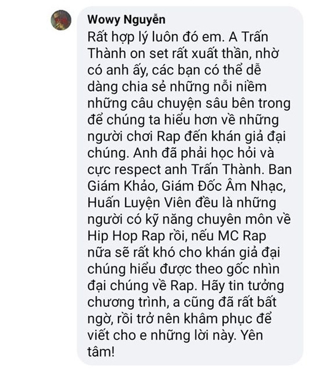 Wowy cho rằng vai trò MC của Trấn Thành là hoàn toàn hợp lý. Thay vì mời tiếp một người có chuyên môn về rap thì show sẽ trở về khô cứng, trong khi Trấn Thành lại là người có khả năng dung hòa, kết nối, giúp người chơi thoải mái trải lòng hơn.