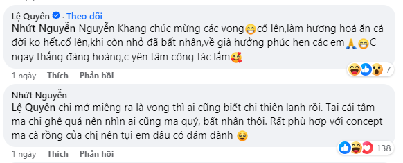 Lệ Quyên bình luận: "Mừng các vong cố lên, làm hương hỏa ăn cả đời không hết cố lên, khi còn nhỏ đã bất nhân, về già hưởng phúc hen các em. Chị ngay thẳng đàng hoàng, chị yên tâm công tác lắm";