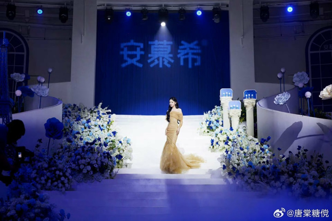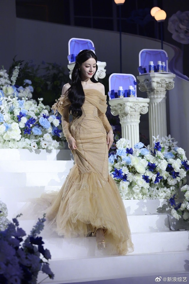 Trong bộ váy trễ vai đuôi cá, Địch Lệ Nhiệt Ba khoe vóc dáng thon thả và đường cong cơ thể quyến rũ. Không chỉ vậy, kiểu tóc xoăn lơi nhẹ nhàng cùng tông trang điểm ngọt ngào còn tôn lên đường nét gương mặt sắc xảo, cuốn hút cùng làn da trắng phát sáng của Nhiệt Ba. Visual nổi bật trong mọi khung hình, chấp cả cam thường quay cận mặt trên sóng livestream và khí chất thanh tao, nhẹ nhàng của mỹ nhân đình đám nhận được nhiều lời khen có cánh từ cộng đồng mạng. Đặc biệt, khoảnh khắc người đẹp 9X xuất hiện từ cầu thang ngập tràn hoa hồng xanh, kết hợp với nhạc nền lãng mạn được ví như cảnh cô dâu trong hôn lễ cổ tích trên phim.