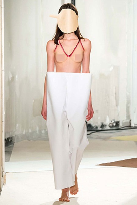 Thiết kế của Jacquemus độc nhất với chiếc quần rộng thùng thình. Nửa trên của người mẫu hoàn toàn để hở. |