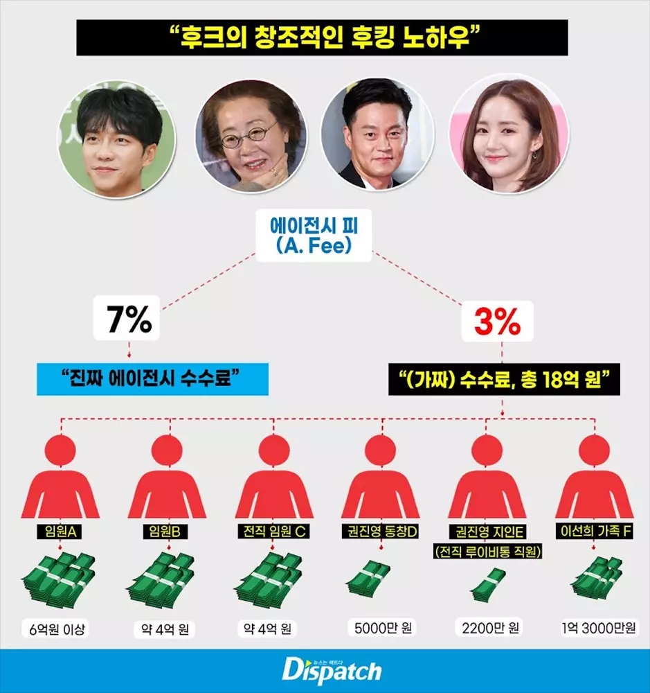 Theo dõi các khoản thu, Dispatch phát hiện ra rằng 3% phí còn thiếu đã được chia cho Giám đốc A, B, C trước đây và hiện tại của HOOK Entertainments, 2 người bạn D và E của CEO Kwon Jin Young và một nhân vật khác (F) là thành viên gia đình ca sĩ Lee Sun Hee.
