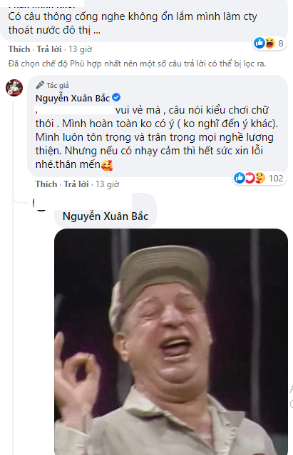 Nghệ sĩ Xuân Bắc lập tức lên tiếng: 'Vui vẻ mà, câu nói kiểu chơi chữ thôi . Mình hoàn toàn ko có ý ( không nghĩ đến ý khác). Mình luôn tôn trọng và trân trọng mọi nghề lương thiện. Nhưng nếu có nhạy cảm thì hết sức xin lỗi nhé.Thân mến!'