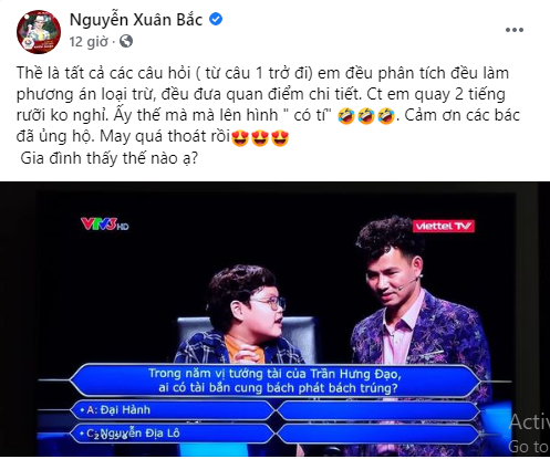 Chương trình Ai là triệu phú lên sóng tối qua (30/3) đã gây sốt với sự xuất hiện đặc biệt của nghệ sĩ Xuân Bắc trong vai trò người chơi và đồng hành cùng nam danh hài là cậu con trai Bi Béo.