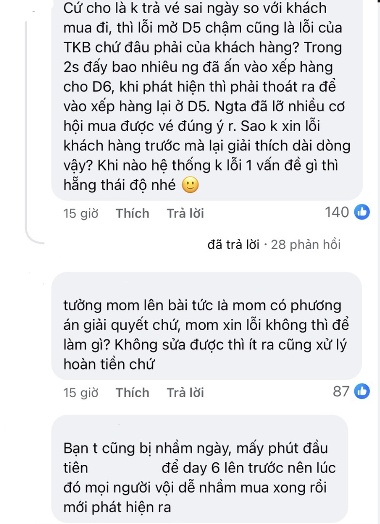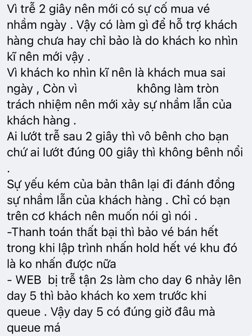 Tuy nhiên, lời giải thích này không nhận được sự đồng tình từ những người gặp lỗi hệ thống khi mua vé. Bởi lẽ, concert D-5 mở bán chậm hơn không phải là lỗi của người mua, chưa kể một bộ fan chỉ ra không phải 2 phút mà BTC mở bán D-5 chậm hơn 30 phút. Với lượng khách khủng cạnh tranh từng tấm vé, chỉ cần thoát ra và xếp hàng lại vào đêm diễn đúng sẽ khiến khách hàng lỡ mất nhiều cơ hội, phải bắt đầu lại từ đầu.
