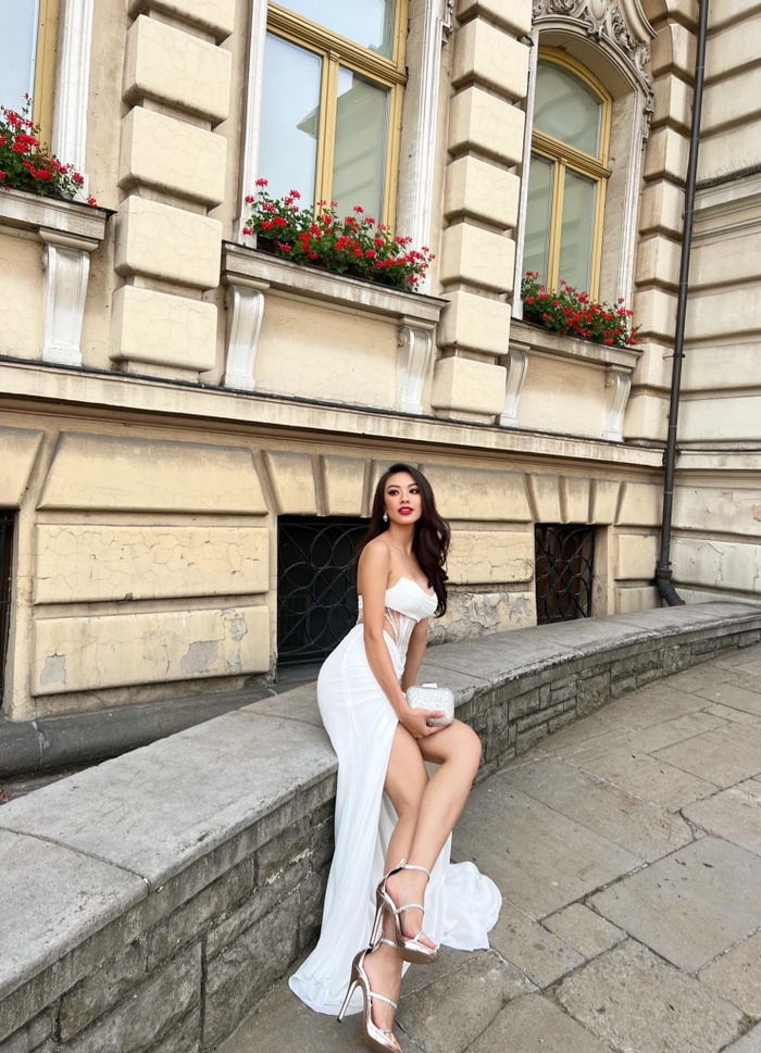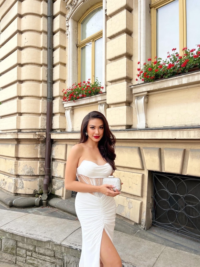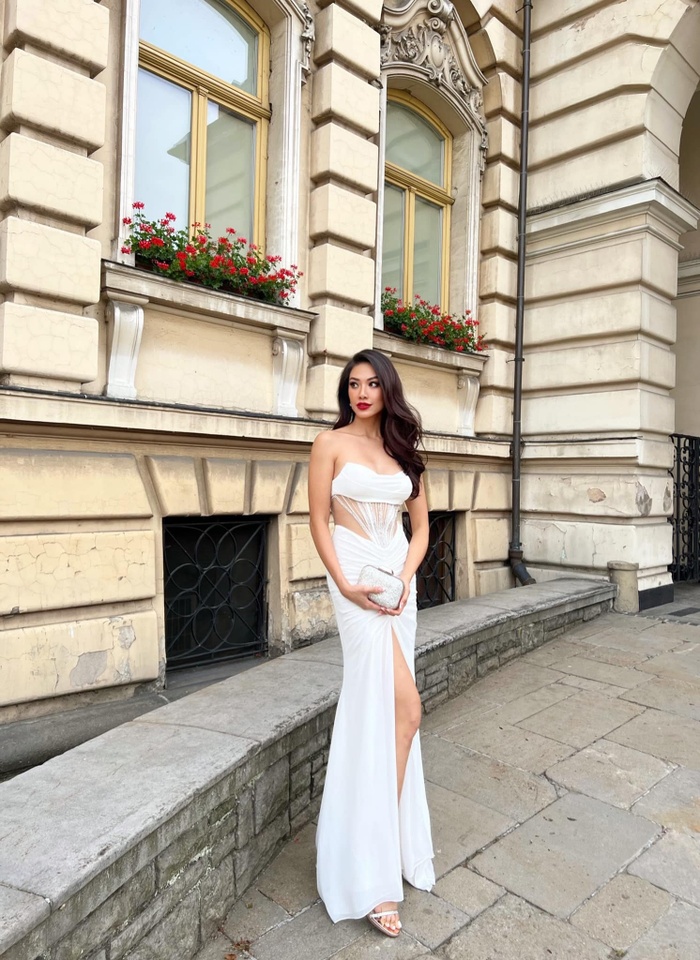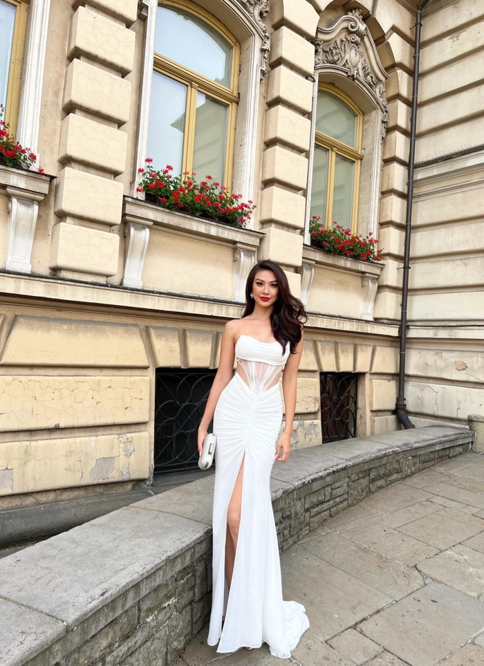 Đại diện Việt Nam - Nguyễn Huỳnh Kim Duyên diện trên người bộ váy màu trắng thanh lịch, thiết kết cắt khoét vòng eo giúp Kim Duyên phô diễn vóc dáng ấn tượng sau chuỗi ngày đốt mỡ trong phòng gym.