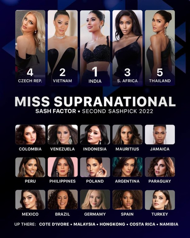 Top 5 cuộc thi còn có các thí sinh của Thái Lan, Nam Phi, Cộng hòa Séc. Đây đều là những gương mặt gây ấn tượng và giành thứ hạng cao trong các phần thi phụ của cuộc thi Hoa hậu Siêu quốc gia 2022.