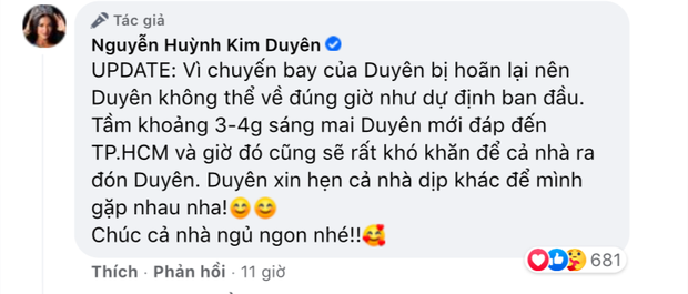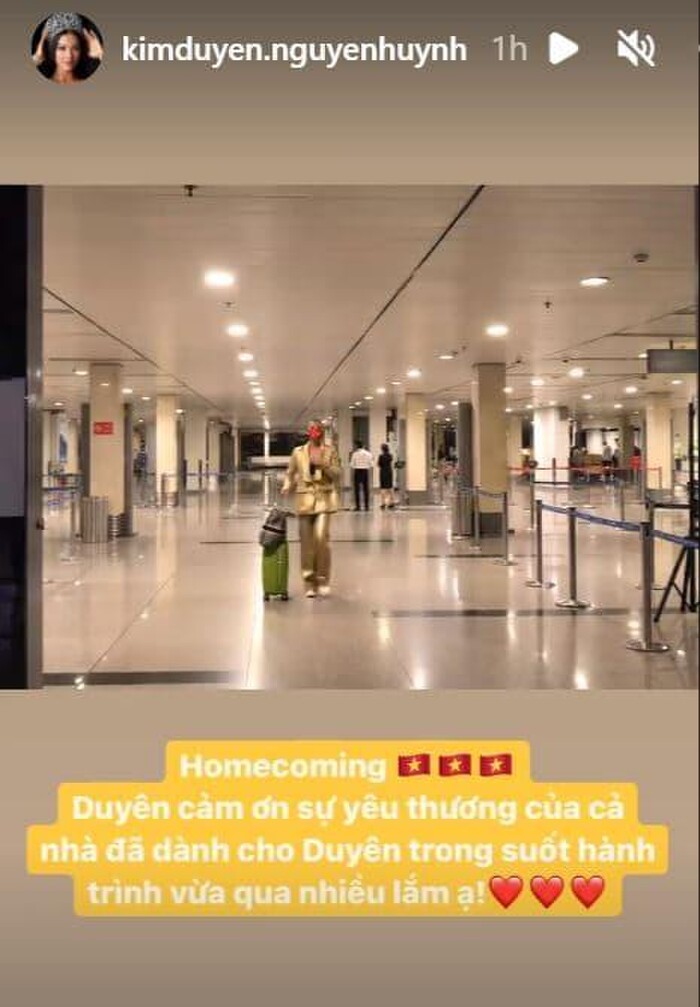 Trải qua chuyến bay dài, nàng hậu đã đáp cánh an toàn tại TP.HCM và đang thực hiện cách ly y tế trước khi tham gia các hoạt động nghệ thuật. Rất nhiều người hâm mộ, bạn bè đã gửi lời chúc và mong Kim Duyên nghỉ ngơi hợp lý sau hành trình dài chinh chiến như "chiến binh".