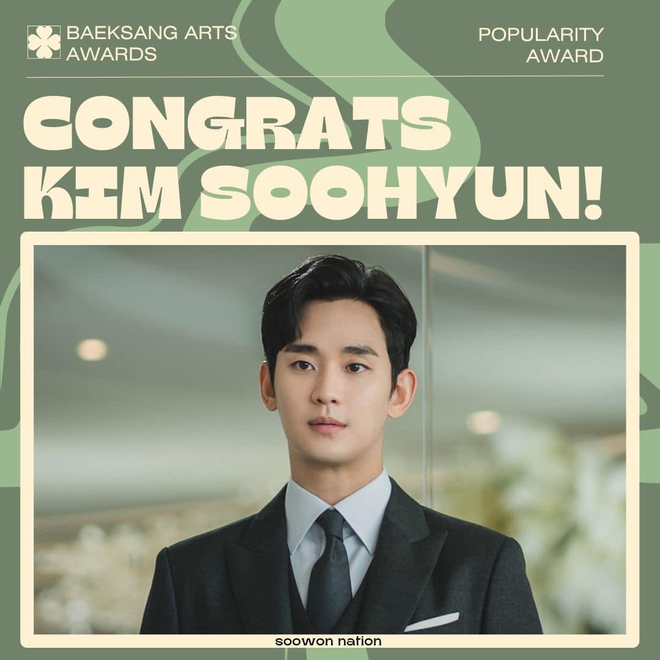 Hiện, ngoài Baeksang Popularity Award thì người hâm mộ còn đang rất mong chờ kết quả từ hạng mục Nam chính xuất sắc nhất khi Kim Soo Hyun là cá nhân duy nhất của Queen of Tears được đề cử ở Baeksang năm nay. Với màn thể hiện cực kỳ thuyết phục cùng sức ảnh hưởng quá lớn từ Queen of Tears, Kim Soo Hyun rất được kỳ vọng sẽ trở thành Thị đế năm nay.