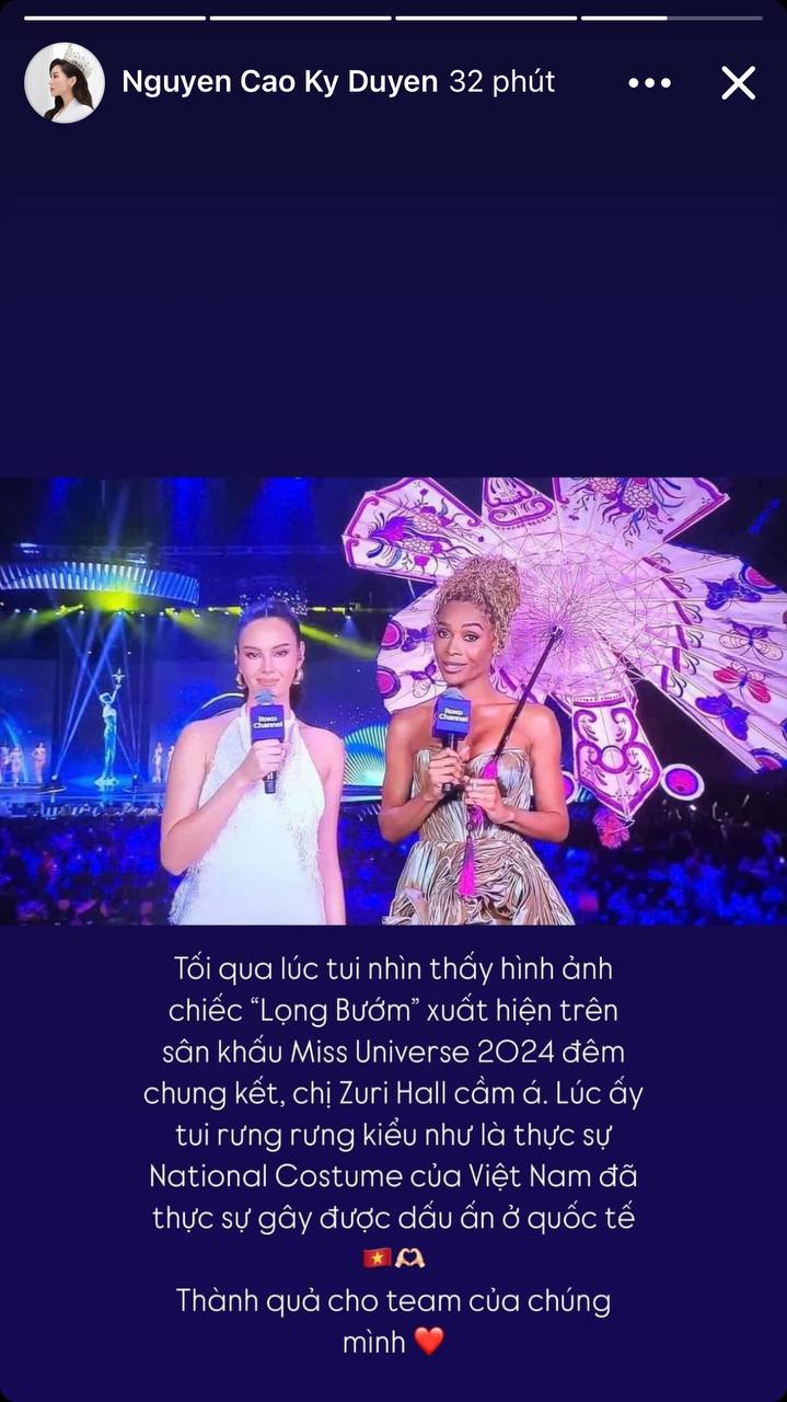 Mới đây, Kỳ Duyên cũng có chia sẻ liên quan đến hình ảnh cực viral này. Miss Universe Vietnam thổ lộ: "Tối qua lúc nhìn thấy hình ảnh chiếc lọng bướm xuất hiện trên sân khấu Miss Universe 2024 đêm Chung kết, chị Zuri Hall cầm á. Lúc ấy tôi rưng rưng kiểu như là thực sự National Costume của Việt Nam đã gây được dấu ấn ở quốc tế. Thành quả cho cả team chúng mình".