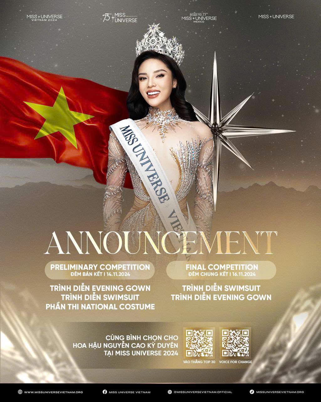 Trước đó, bà Thuý Nga - thành viên tổ chức Miss Universe Vietnam nhận xét về Kỳ Duyên: "Chúc đại diện Việt Nam tại Miss Universe 2024 ngày càng nhiều năng lượng, giữ được phong độ ổn định, phát huy phong cách thời trang, vốn là thế mạnh của cô. Và quan trọng nhất là có được chiến thuật ém mọi cái đến những giai đoạn quan trọng nhất mới bung, như cách cô đã sử dụng tại Miss Universe khiến Ban giám khảo và mọi người đều sửng sốt".