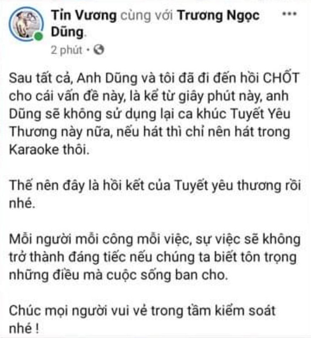 Tưởng sự việc sẽ chấm dứt thì vào ngày 1/12, rapper T.I.N đã có một bài đăng trên trang cá nhân nói rằng kể từ giờ, ca khúc sẽ không được sử dụng lại trên bất kỳ sân khấu nào nữa. Nếu có thì sẽ chỉ được hát trong Tuyết Yêu Thương những buổi hát karaoke mà thôi.