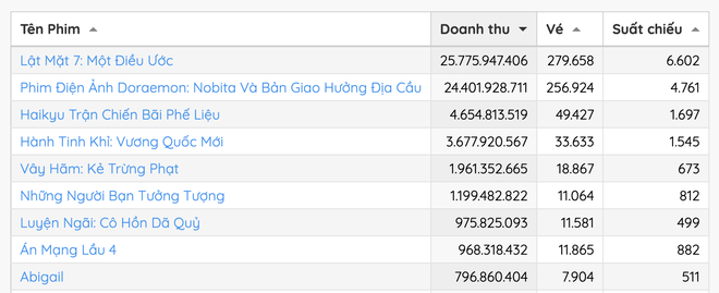 Tuần qua, Lật Mặt 7: Một Điều Ước tiếp tục dẫn đầu bảng xếp hạng doanh thu dịp cuối tuần với thành tíchh 25,7 tỷ. Trong khi đó, Phim Điện Ảnh Doraemon: Nobita Và Bản Giao Hưởng Địa Cầu bám đuổi sát phía dưới với doanh thu 24 tỷ đồng. Tuần này, bom tấn Furiosa: A Mad Max Saga cũng chính thức ra rạp, dự kiến sẽ ảnh hưởng tới doanh thu của Lật Mặt 7: Một Điều Ước.