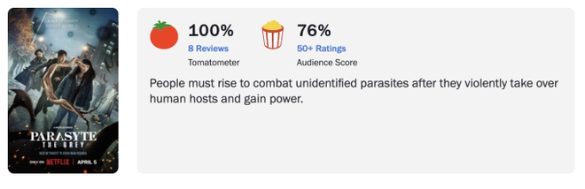 Vào thời điểm hiện tại, không bộ phim Hàn nào có độ bàn tán và chất lượng vượt qua được Parasyte: The Grey (tên tiếng Việt: Ký Sinh Thú: Vùng Xám ). Sau 10 ngày dẫn đầu lượt xem toàn cầu trên nền tảng Netflix, dự án mới đây đã mở màn với điểm tuyệt đối 100% trên Rotten Tomatoes, nhận về nhiều lời khen ngợi từ giới phê bình quốc tế.
