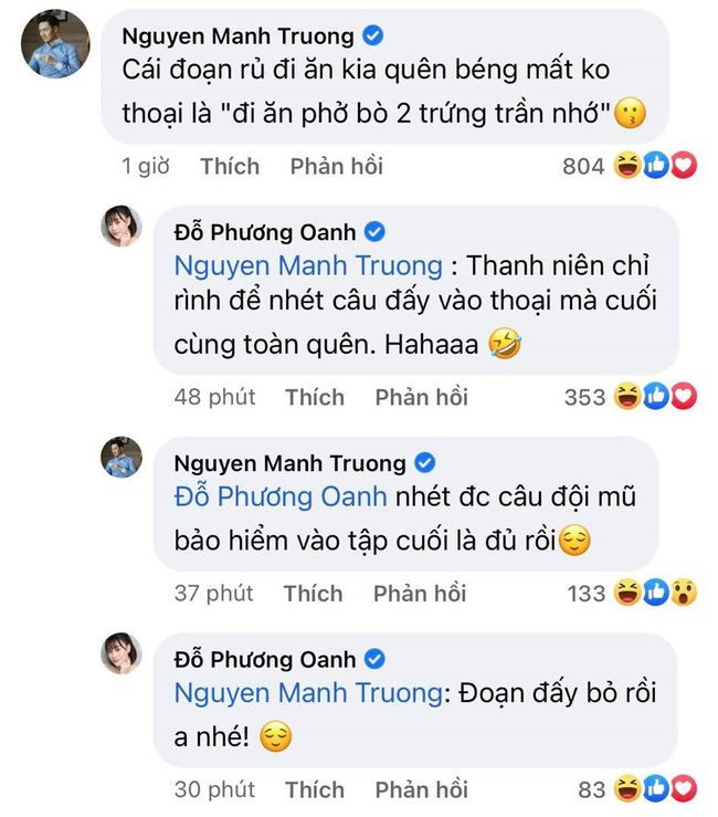 Ngoài ra, để trả lời Phương Oanh, Mạnh Trường cũng hé lộ có thể anh quên "phở bò 2 trứng trần", nhưng đã "nhét" được câu thoại "đội mũ bảo hiểm" vào tập cuối phim. Tuy nhiên Phương Oanh chia sẻ: "Đoạn đấy bỏ rồi anh nhé" khiến khán giả tò mò không biết 2 diễn viên đang nói đến tình huống nào.