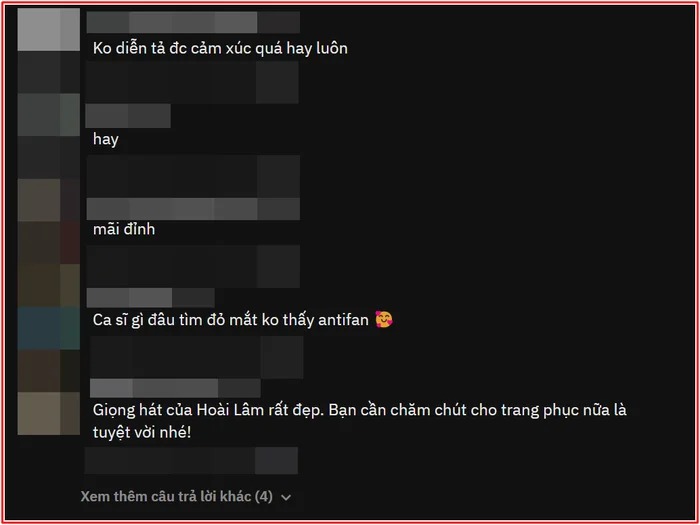 Không những thế, những đoạn luyến láy, nốt phiêu của Hoài Lâm trong tiết mục này cũng nhận được nhiều lời khen từ phía người nghe vì sự phù hợp, mang đến sự mới mẻ cho ca khúc. Bên dưới đoạn clip được đăng tải, đông đảo cư dân mạng đã dành nhiều lời tán thưởng cho giọng hát đầy cảm xúc, nội lực của giọng ca Như những phút ban đầu.
