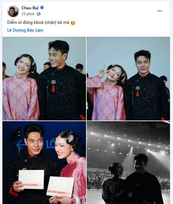 | Lê Dương Bảo Lâm và Châu Bùi tại sân khấu sự kiện gala vinh danh và trao giải WeChoice Awards 2024 |