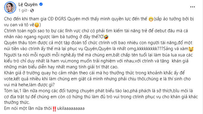 Về tin đồn cô thâu tóm chương trình, Lệ Quyên cho biết: "Chương trình toàn ngôi sao to bự các lĩnh vực chứ có phải tìm kiếm tài năng trẻ để debut đâu mà cá nhân nào ngang ngược làm bà tướng ở đây thế? Quyên thâu tóm được cả một tập đoàn tổ chức chương trình với bao nhiêu con người tài năng, đổ một núi tiền vào chương trình ấy thế mà lại phục vụ Quyên ư?"