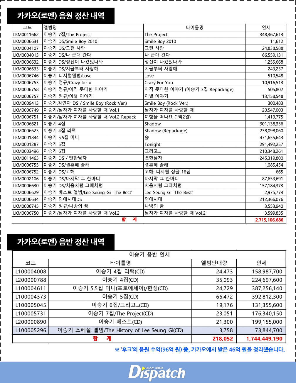 Sáng ngày 21/11, trang tin Dispatch của Hàn Quốc đưa tin, họ đã có được báo cáo chi tiết về hoạt động âm nhạc cũng như lợi nhuận thu được từ các hoạt động của tài tử Lee Seung Gi trong 18 năm dưới trướng công ty Hook Entertainment.