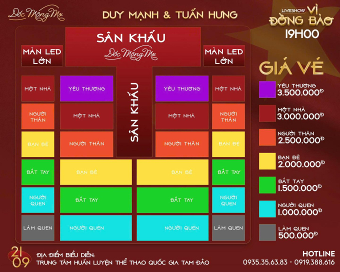 Đêm nhạc của Duy Mạnh và Tuấn Hưng sẽ tổ chức vào tối 21/9 ở Tam Đảo. Vào hôm qua, sơ đồ bán vé và chỗ ngồi cũng đã được đăng tải với tổng cộng 7 hạng vé được bán ra cho đêm nhạc này. Mức vé rẻ nhất (Làm Quen) là 500 nghìn đồng, mức cao nhất (Yêu Thương) là 3.5 triệu đồng. Chỉ sau hơn nửa ngày mở cổng bán vé, 2 hạng vé có giá dễ chịu nhất (Người Quen - 1 triệu đồng và Làm Quen - 500 nghìn đồng) cũng đã được bán hết.