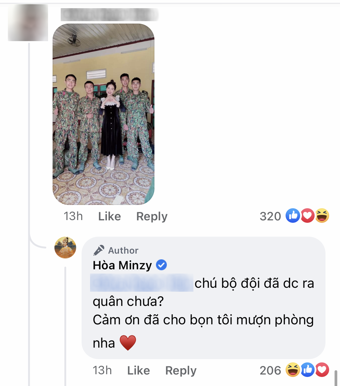 Trong một bài đăng của Hòa Minzy trên mạng xã hội mới đây, các fan bất ngờ phát hiện ra nữ ca sĩ dùng nick tương tác với tài khoản lạ. Theo dõi đôi bên trò chuyện khán giả mới biết thì ra Hòa Minzy gặp lại đồng đội cũ trong đơn vị nơi chương trình Sao Nhập Ngũ ghi hình. Cụ thể, anh bộ đội này đã đăng tải tấm hình cùng Hòa Minzy vui vẻ chụp ảnh kỷ niệm với nhiều đồng chí khác. Hòa Minzy hào hứng phản hồi người quen: "Chú bộ đội đã được ra quân chưa? Cảm ơn đã cho bọn tôi mượn phòng nha...".