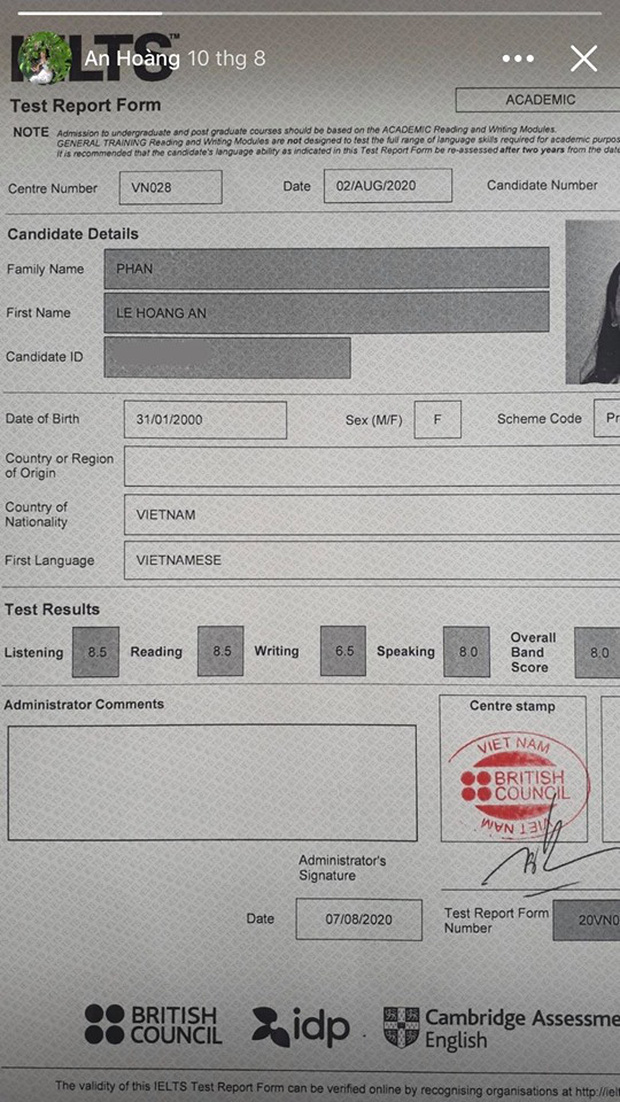 Đáng nói nhất, thí sinh này có thể giao tiếp tốt 2 ngôn ngữ là tiếng Anh và tiếng Tây Ban Nha. Điểm IELTS của Hoàng An là 8.0, kỹ năng nghe và đọc đạt 8.5 điểm, thành tích của cô vượt mặt luôn cả Hoa hậu Lương Thuỳ Linh. Được biết, thời điểm đăng quang Hoa Hậu Thế Giới Việt Nam, Lương Thuỳ Linh có điểm IELTS 7.5. Với loạt thành tích khủng này, Hoàng An đến nay đã trở thành "thánh ngôn ngữ" trong Hoa Hậu Việt Nam 2020, được fan sắc đẹp đặt nhiều kỳ vọng trong mùa năm nay.