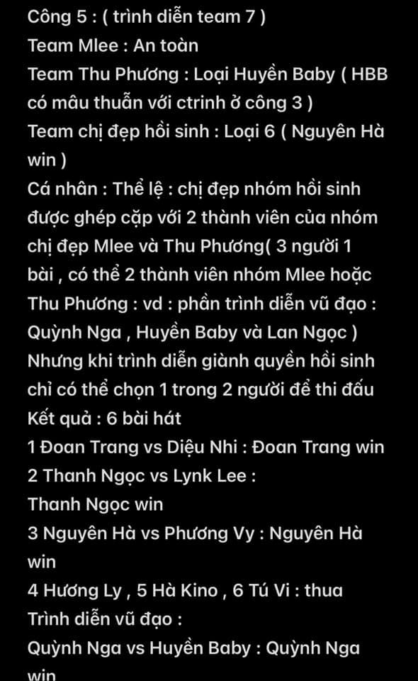 Trước khi vòng công diễn 5 lên sóng, mạng xã hội đã râm ran đồn thổi về kết quả loại trừ. Theo đó, Huyền Baby được cho là đại diện cho đội Thu Phương ra thi thố cùng Quỳnh Nga (đội hồi sinh). Tuy nhiên, vì Huyền Baby không được khán giả có mặt trong trường quay bình chọn nhiều bằng Quỳnh Nga nên đã thua cuộc. Kết thúc vòng công diễn 5, Huyền Baby là người phải ra về.