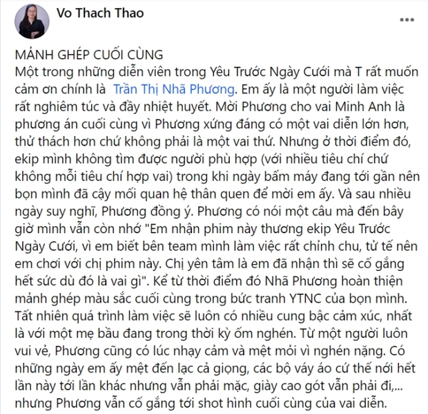 Ngay khi những tập đầu tiên của Yêu Trước Ngày Cưới lên sóng, vô số bình luận xoay quanh vấn đề tại sao Nhã Phương lại đóng vai phụ. Mới đây, nữ đạo diễn này cũng đã đăng tải một bài viết dài xoay quanh Nhã Phương và vai diễn Minh Anh của cô.