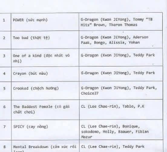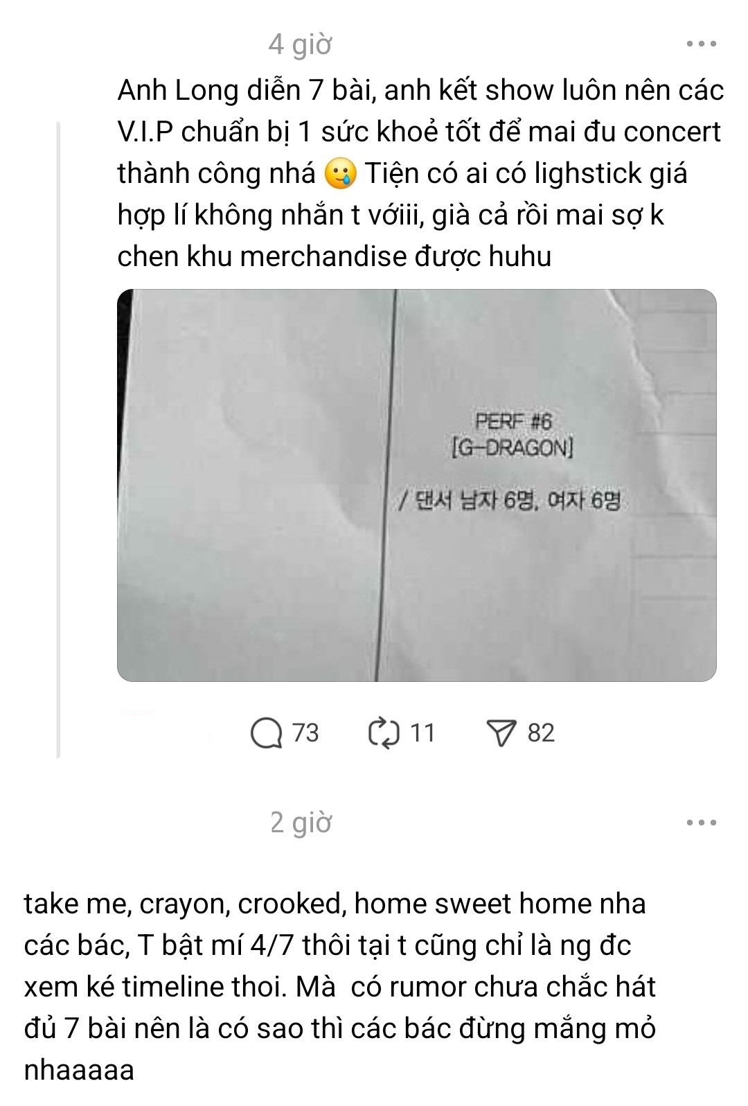 Gần đây, trên MXH xuất hiện nhiều nguồn tin "leak" set nhạc G-Dragon sẽ trình diễn ở mega concert tại Mỹ Đình hôm 21/6. Trong đó, có nguồn cho biết G-Dragon biểu diễn 5 ca khúc, toàn hit gắn với tên tuổi gồm Power, Too Bad, Crayon, One of a Kind, Crooked. Có người thì lan truyền ảnh được cho là kịch bản chương trình, hé lộ set diễn GD sẽ là 7 ca khúc, trong đó có 4 ca khúc Take Me, Crayon, Crooked, Home Sweet Home. Ngoài ra, nhiều fan "camp" ở Mỹ Đình cũng nghe được danh sách 6 ca khúc tổng duyệt gồm: Power, Home Sweet Home, Crooked, Too Bad, Crayon, IBELONGIIU.