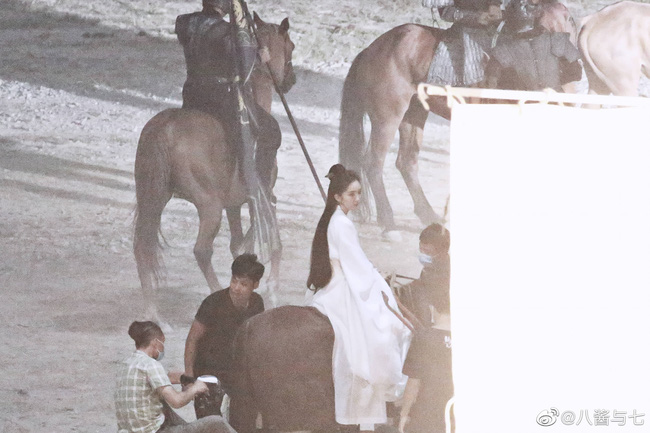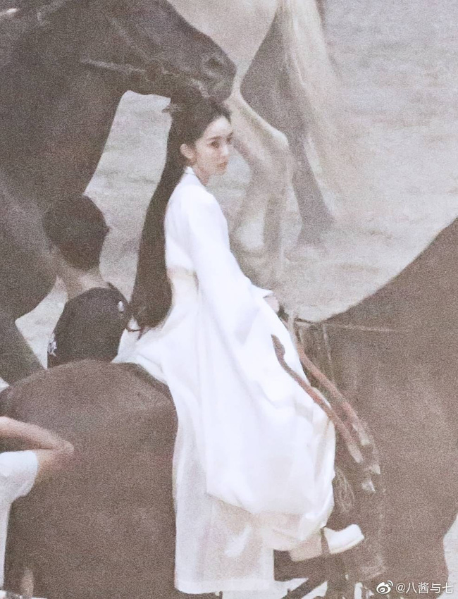 Nữ diễn viên ngồi trên lưng ngựa, mặc trang phục trắng dịu dàng và để lộ khí chất thanh tao, cuốn hút.