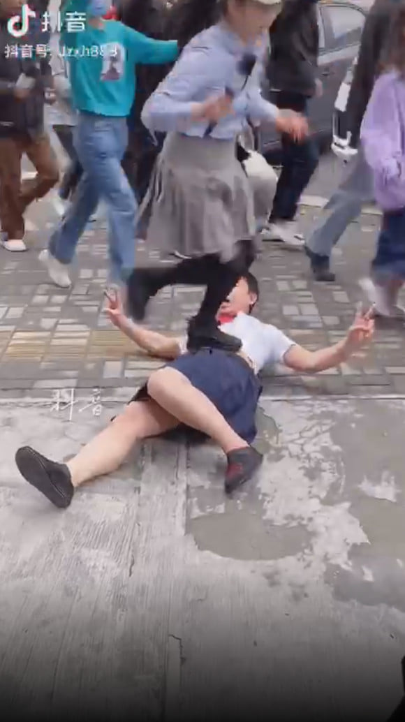 Cụ thể, người thanh niên này phải mặc đồ nữ sinh, chẳng hiểu tình huống là gì mà lại nằm vật ra giữa đường ngất xỉu. Lúc này, một đoàn người chạy ngang qua, ngang nhiên giẫm đạp lên anh để bước tiếp, trong số đó không chỉ có dân thường mà còn có phóng viên. Nhiều người phỏng đoán đây có lẽ là cảnh phim khi một người nổi tiếng bị bại lộ thân phận nên bị dân chúng rượt theo.