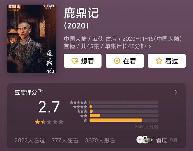 Bộ phim Lộc Đỉnh Ký 2020 đã phát sóng 8 tập mở màn vào tối 15/11. Phim có sự tham gia của Trương Nhất Sơn, Đường Nghệ Hân, Chu Châu, Dương Kỳ Như...Tuy thu hút được sự chú ý và chờ đợi của khán giả nhưng ngay khi phim lên sóng đã nhận điểm 2,7 trên Douban với vô số lời chê bai, phần lớn đều hướng vào diễn xuất đáng sợ của nam chính Trương Nhất Sơn trong vai Vi Tiểu Bảo.