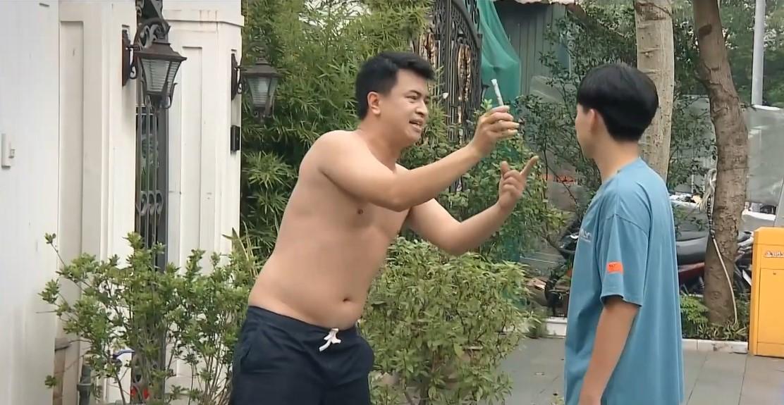 "Mày lấy tiền của bố tao mà bây giờ mày còn bảo mày trả tiền viện phí. Trả tiền của bố tao đây", con trai ông Thành túm áo Dũng lu loa ăn vạ đòi tiền ngay trước cổng nhà cậu.