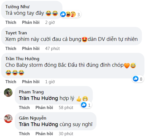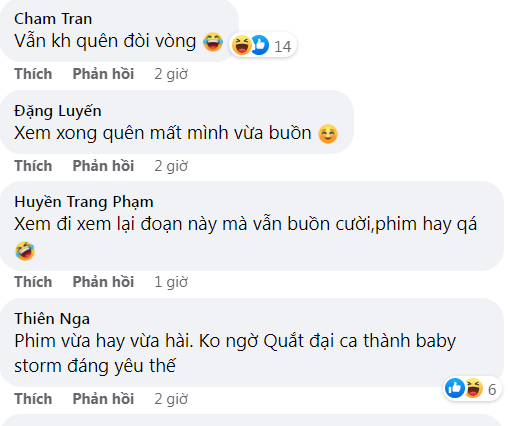 Hơn thế những lời thoại và biểu cảm của Mạnh Quân trong phân đoạn này cũng khiến khán giả vô cùng thích thú: "Anh gọi em là Bão? Sao lúc mới yêu anh bảo tên Bão nghe thô, anh chuyển sang gọi là Storm, Baby Storm – cơn bão nhỏ của anh cơ mà?”. Thắng tức giận quát lớn đuổi Bão đi thì anh chàng lại có ngay câu thoại cực trend : 'Anh quát em à? Nói to thế á?'