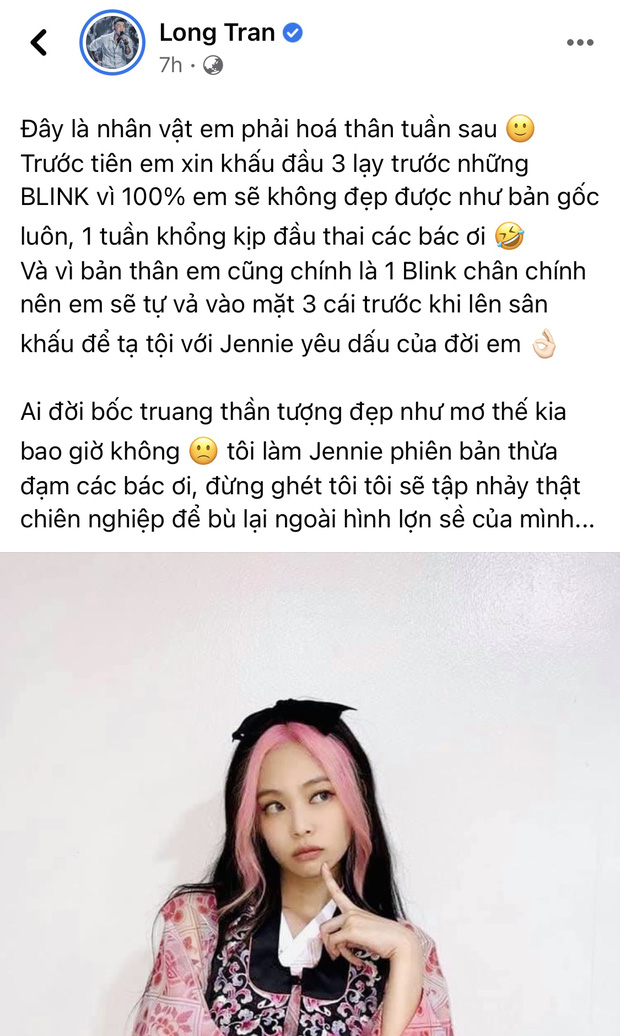 Mới đây, Long Chun đã bật mí trên trang cá nhân: anh sẽ "hoá thân" thành Jennie trong tập sắp tới. Hot TikToker cho biết bản thân anh là một BLINK chân chính, xin khấu đầu 3 lạy trước BLINK vì không đẹp được như bản gốc. Long Chun còn đòi tự vả 3 cái vào mặt trước khi lên sân khấu để "tạ tội" với Jennie.