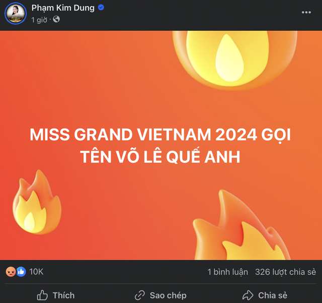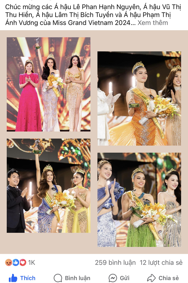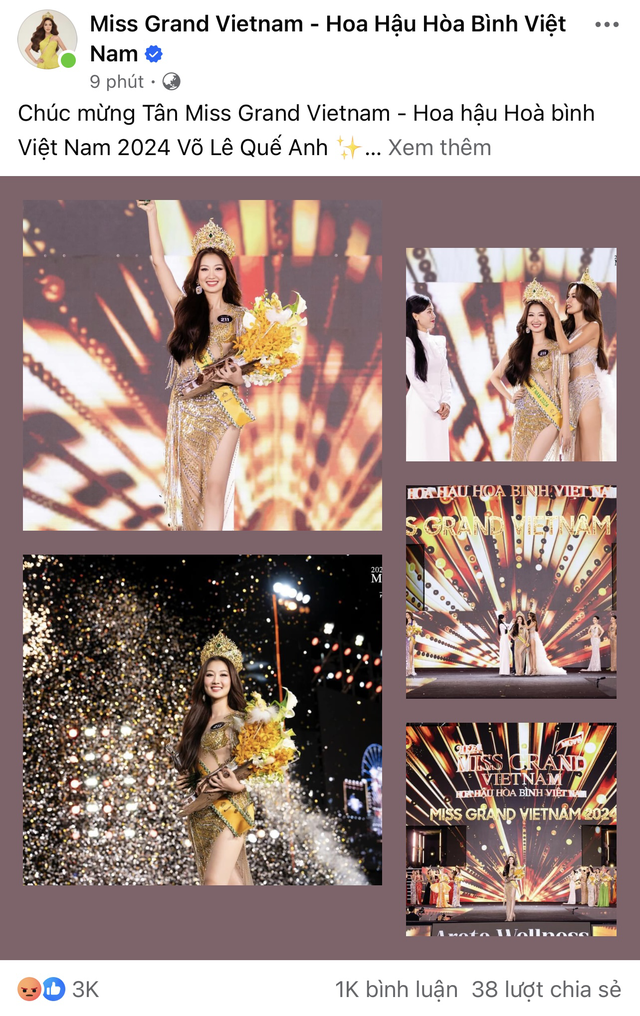 Hiện tại, netizen đang liên tiếp thả phẫn nộ vào các bài đăng trên fanpage chính thức của Miss Grand Vietnam. Đặc biệt, những hình ảnh có sự xuất hiện của Hoa hậu Võ Lê Quế Anh trên các trang, hội nhóm cũng đang nhận về "bão" phẫn nộ. Ngoài ra, các bài viết của bà Phạm Kim Dung - Chủ tịch cuộc thi Miss Grand Vietnam cũng đang bị những hành động tương tự. "Dì Dung" chọn cách khóa bình luận để kiểm soát comment tiêu cực.