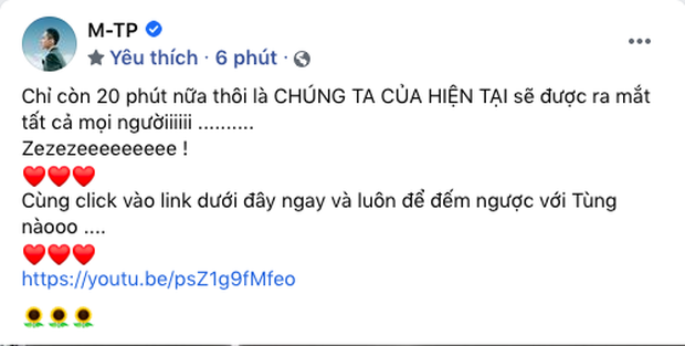 Trước khi MV lên sóng khoảng 15 phút, Sơn Tùng M-TP đã bất ngờ đăng tải hình ảnh "hóng" sản phẩm của mình lên sóng cùng hàng chục nghìn người hâm mộ. Trên trang page, Sơn Tùng M-TP không quên kêu gọi các fan cùng truy cập vào link công chiếu MV và đếm ngược đến giờ Chúng Ta Của Hiện Tại lên sóng.