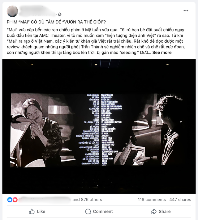 Bài viết của nhà sản xuất này hiện thu hút đông đảo sự chú ý của những người yêu điện ảnh ở Việt Nam và quốc tế. Nhiều người đồng ý rằng Mai của Trấn Thành thực sự chưa đủ chất lượng để chinh phục khán giả nước ngoài, chỉ phù hợp với người xem trong nước. Trong khi đó, một vài ý kiến khác cho rằng tác phẩm có nhiều điểm sáng khi đánh đúng thị hiếu của một bộ phận người xem. Một khán giả nhận định: "Ra thế giới để người Việt xa xứ xem, cũng là một sự cống hiến cho cộng đồng của mình. Tham vọng xa hơn thì chưa tới. Với cá nhân mình thì xem được, không thấy phí thời gian".