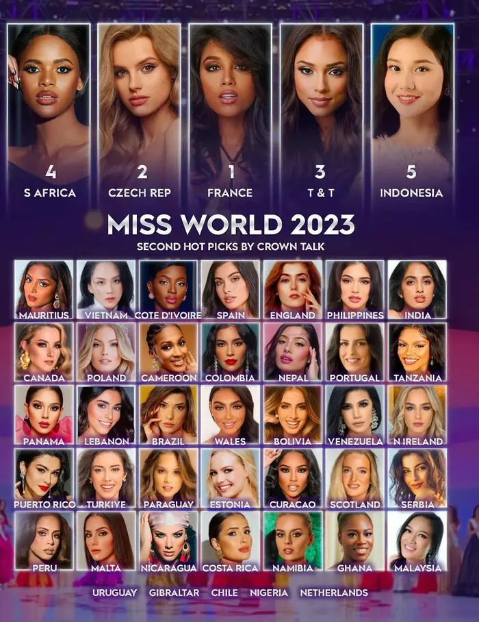 Trong BXH này, đại diện Pháp được dự đoán sẽ đăng quang ngôi vị cao nhất. Trong Top 7, khu vực Đông Nam Á còn có sự góp mặt của đại diện Indonesia. Theo fan sắc đẹp, đấu trường Miss World 2022 sẽ là cuộc chiến cạnh tranh khá chẳng khi chất lượng thí sinh cao. Không chỉ nhan sắc đồng đều, các thí sinh còn có nhiều thời gian chuẩn bị cho các kỹ năng về trình diễn, ứng xử, ngoại ngữ...