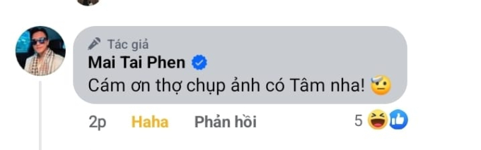 Nam diễn viên viết: "Cảm ơn thợ chụp ảnh có Tâm nha". Bên dưới bình luận của Mai Tài Phến, fan của Mỹ Tâm vào đáp lại với lời lẽ khá hài hước: "Thợ chụp ảnh có Tâm hay là anh nhìn camera có Tâm", "Miệng thì nói vẫn còn độc thân nhưng tay lại viết có Tâm, Tình trạng quan hệ sượng quá sượng anh ơi".