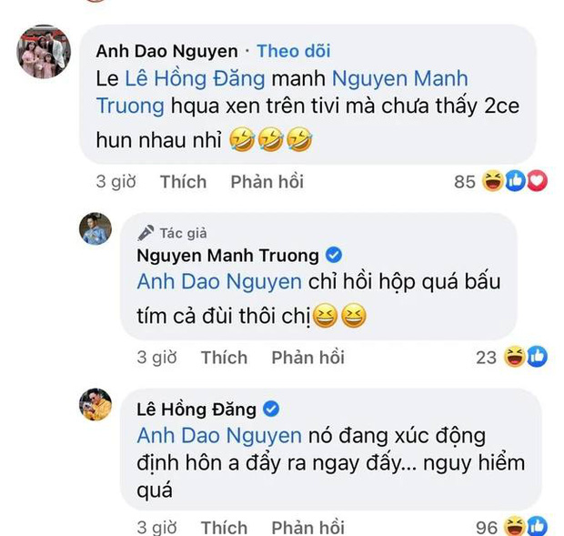 Hồng Đăng cũng "mặn mà" không kém khi tấu hài ngược lại: "Nó đang xúc động định hôn anh đẩy ngay ra đấy. Nguy hiểm quá".