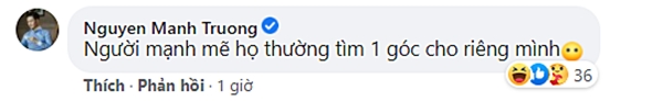 Bên dưới bài đăng của thành viên ê kíp Hương vị tình thân, Mạnh Trường cũng vào comment: "Người mạnh mẽ họ thường tìm một góc cho riêng mình".