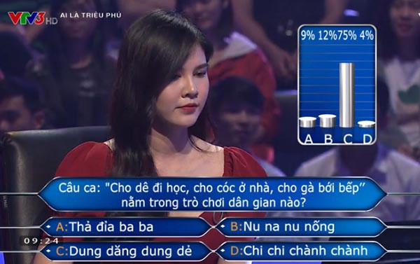 Ở ngay câu hỏi thứ 3, Thu Hoài đã sử dụng quyền trợ giúp của khán giả ở trường quay khi được đố Câu ca: "Cho dê đi học, cho cóc ở nhà, cho gà bới bếp" nằm trong trò chơi dân gian nào?".