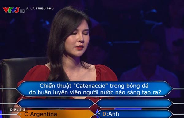 Sang đến câu hỏi thứ 7, MC Thu Hoài được người dẫn chương trình đặt câu hỏi liên quan đến bóng đá: "Chiến thuật "Catenaccio" trong bóng đá do huấn luyện viên người nước nào sáng tạo ra?".
