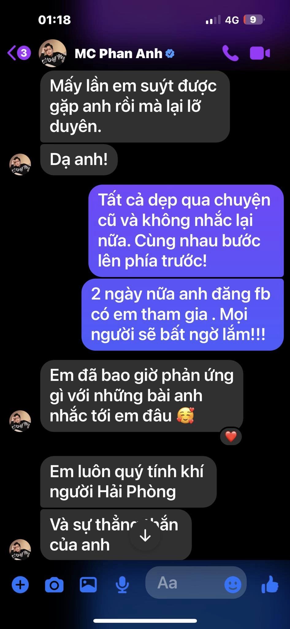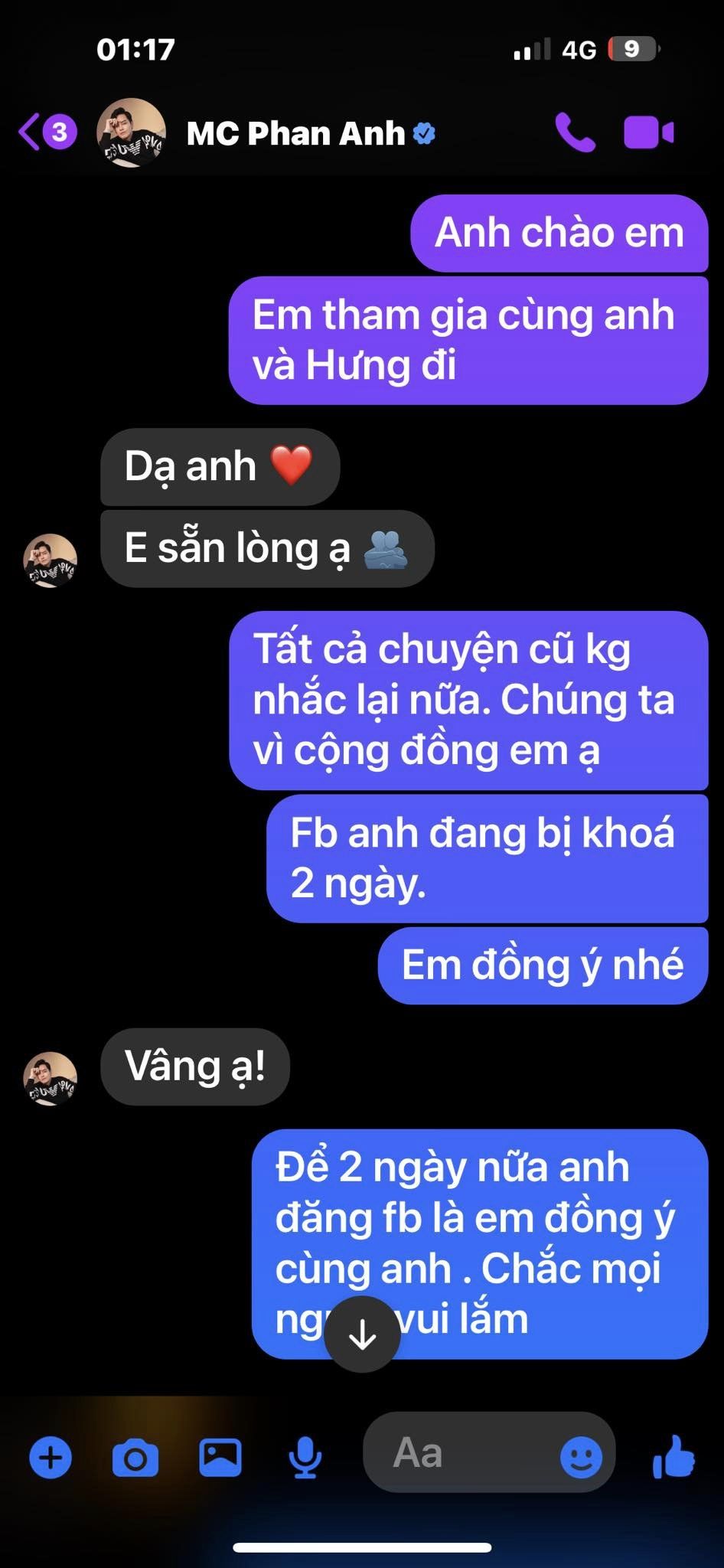 Theo đó, vào ngày 13/9, Duy Mạnh nhắn tin mời Phan Anh góp mặt trong đêm nhạc Anh em kết đoàn. Anh nói với nam MC: "Tất cả chuyện cũ không nhắc lại nữa, chúng ta vì cộng đồng em ạ".
