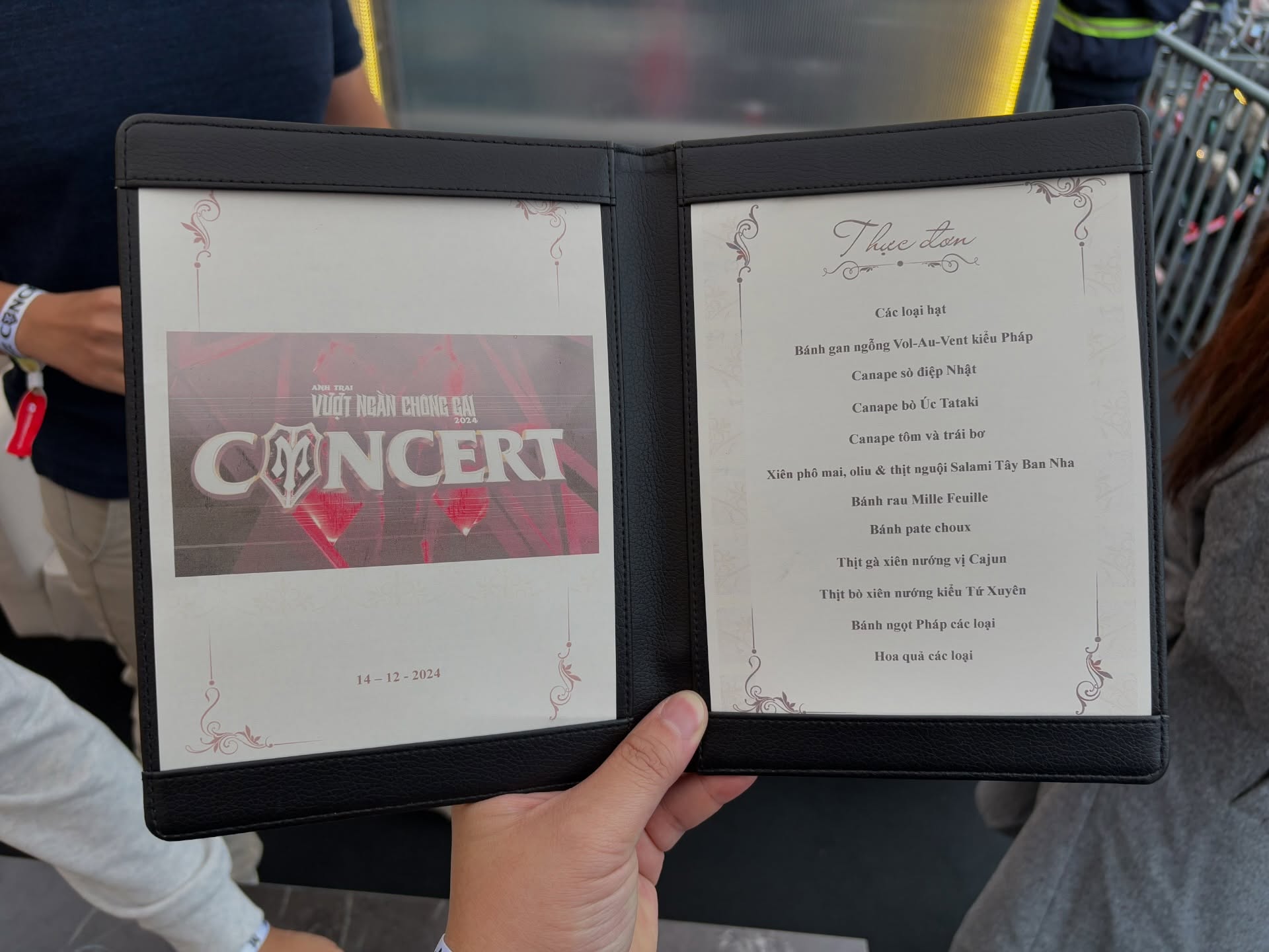 Như đã biết, tối nay (14/12) sẽ chính thức diễn ra đêm concert của chương trình Anh Trai Vượt Ngàn Chông Gai tại Vinhomes Ocean Park 3, thu hút sự quan tâm của đông đảo dân tình khắp nơi. Đáng chú ý, hình ảnh menu ăn uống dành cho hạng vé XVIP được một vị khách chia sẻ đã nhanh chóng thu hút sự quan tâm của rất nhiều người bởi danh sách món không chỉ đa dạng, mà còn toàn những món ăn hấp dẫn mang hương vị từ khắp nơi trên thế giới.