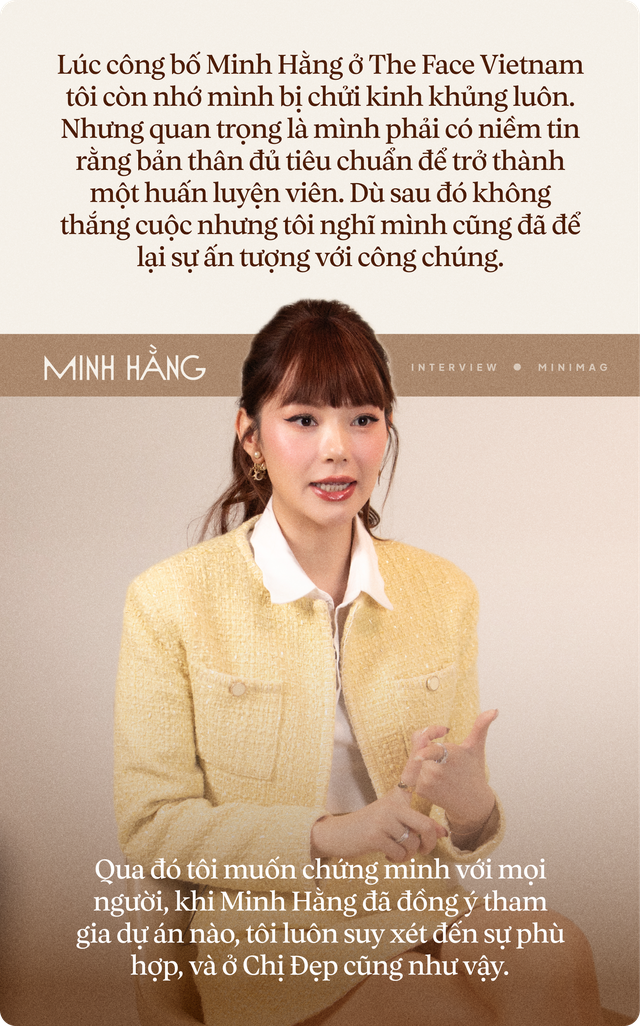 Lúc công bố Minh Hằng ở The Face Vietnam tôi còn nhớ mình bị chửi kinh khủng luôn. Nhưng quan trọng là mình phải có niềm tin rằng bản thân đủ tiêu chuẩn để trở thành một huấn luyện viên. Dù sau đó không thắng cuộc nhưng tôi nghĩ mình cũng đã để lại sự ấn tượng với công chúng. Qua đó tôi muốn chứng minh với mọi người, khi Minh Hằng đã đồng ý tham gia dự án nào, tôi luôn suy xét đến sự phù hợp, và ở Chị Đẹp cũng như vậy.