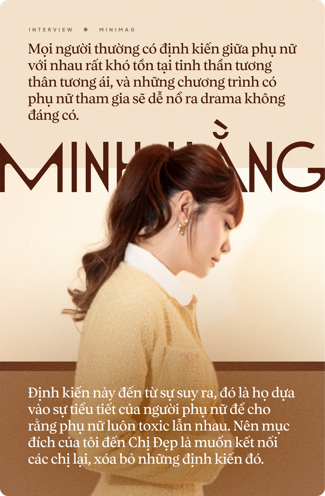 Với mọi người như thế nào tôi không rành lắm, nhưng tôi thì cũng có nói thẳng với NSX rằng tôi đến với Chị Đẹp vì thích tinh thần của Chị Đẹp, kể cả phiên bản nước ngoài hay trong nước tôi đều thấy được các chị rất tương thân tương ái với nhau. Mọi người thường có định kiến giữa phụ nữ với nhau rất khó tồn tại tinh thần đó và những chương trình của phụ nữ tham gia dễ nổ ra drama không đáng có. Định kiến này đến từ sự suy ra, đó là họ dựa vào sự tiểu tiết của người phụ nữ để suy ra phụ nữ sẽ toxic lẫn nhau. Nên mục đích của tôi đến Chị Đẹp là muốn kết nối các chị lại, xóa bỏ những định kiến đó.