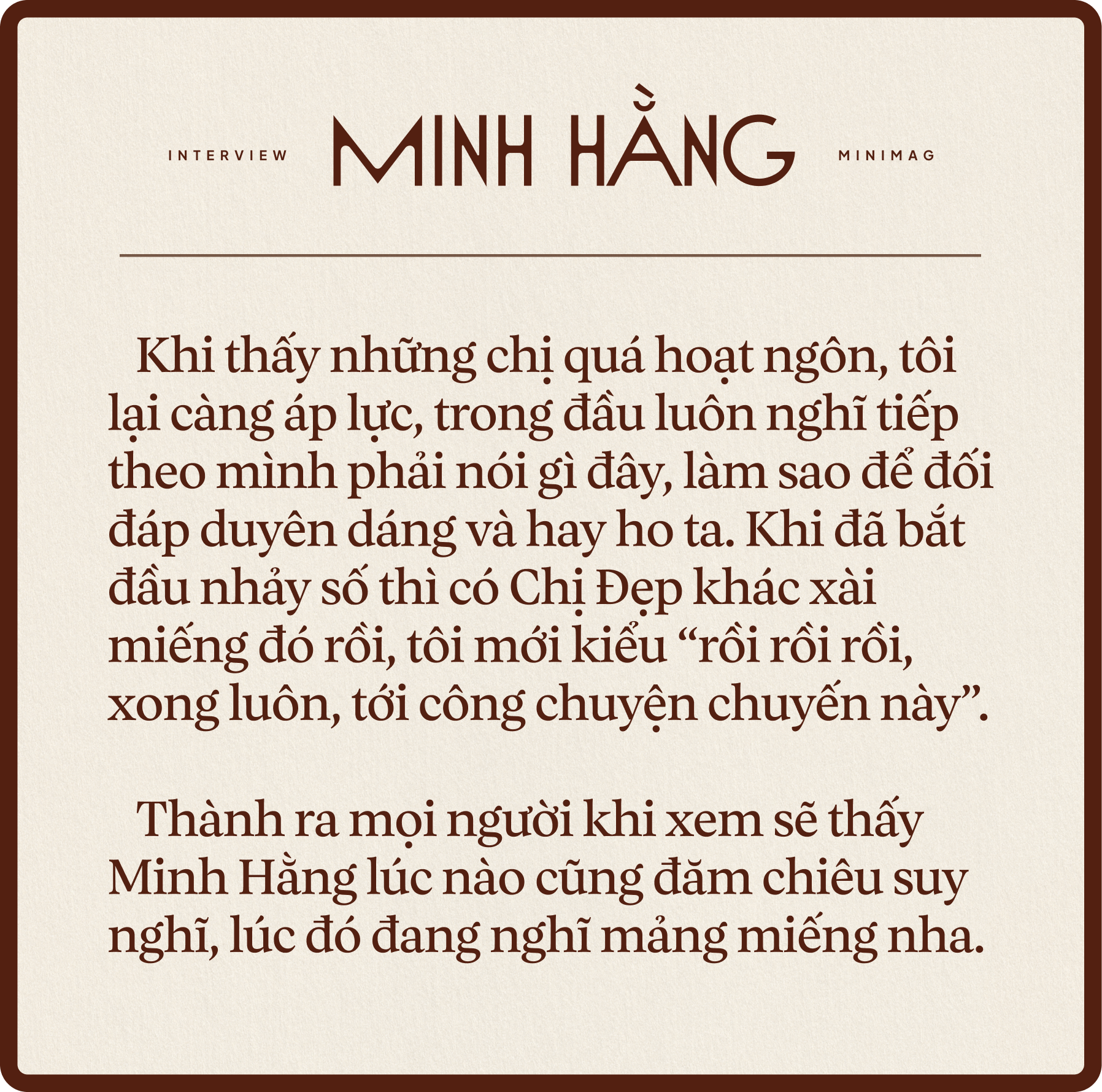 Khi thấy những chị quá hoạt ngôn, tôi lại càng áp lực, trong đầu luôn nghĩ tiếp theo mình phải nói gì đây, làm sao để duyên dáng và đối đáp hay ho ta. Khi bắt đầu nhảy số thì có Chị Đẹp khác xài miếng đó rồi, tôi mới kiểu "rồi rồi rồi, xong luôn, tới công chuyện chuyến này". Thành ra mọi người khi xem sẽ thấy Minh Hằng lúc nào cũng đăm chiêu suy nghĩ, thì lúc đó đang nghĩ mảng miếng nha. (Hahaha)
