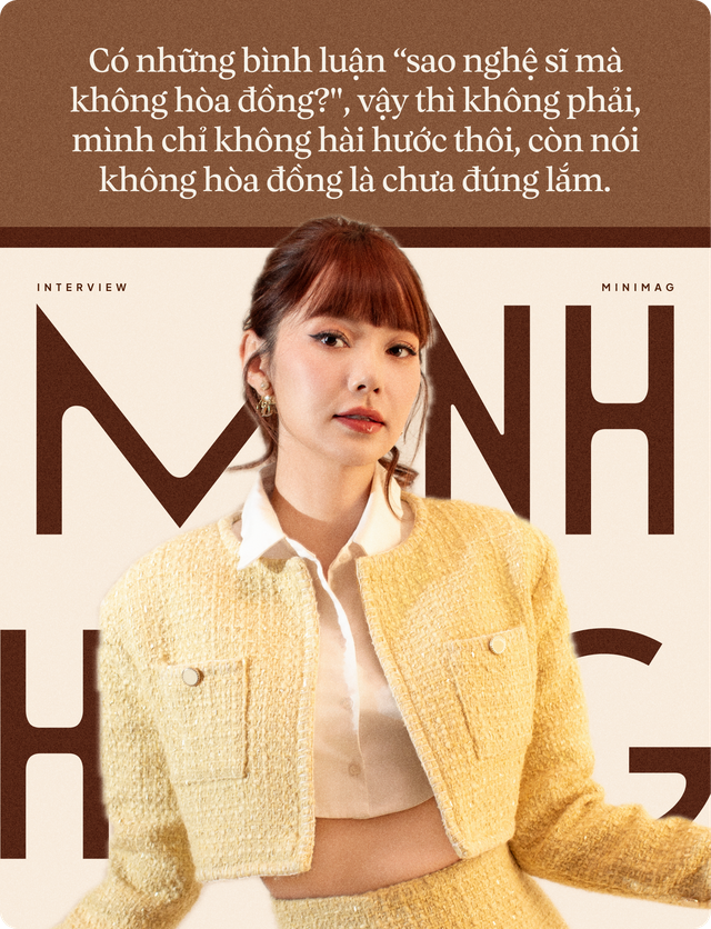 (Hahaha) Những sự lầy lội thường không nằm trong ống kính nhiều đâu, và ống kính cũng khó bắt được 24/24 những gì mà các chị em chia sẻ với nhau. Không biết mọi người thế nào nhưng với tôi, khi có máy quay hướng đến thì bên trong mình như có một công tắc tự động buộc mình phải nghiêm túc, phải suy nghĩ, phải tập trung. Vì tôi đã làm việc quá nhiều năm rồi nên trạng thái đó hình thành như một thói quen lúc nào cũng không hay. Nên khi vào chương trình thực tế, con người mình sẽ được khai thác triệt để, vì vậy khi lên hình mọi người sẽ cảm nhận rất rõ Minh Hằng hơi nghiêm túc, ít giỡn hớt là như vậy. Cũng có những bình luận "sao nghệ sĩ mà không hòa đồng?", vậy thì không phải, mình chỉ không hài hước thôi, còn nói không hòa đồng thì chưa đúng lắm nha mọi người. Khúc này không phải tự biện minh gì đâu, tôi chỉ là muốn chia sẻ thêm để mọi người hiểu câu chuyện khai thác của những reality show là như thế nào. Tôi nghĩ với những gì sẽ diễn ra sắp tới thì chương trình sẽ có nhiều cái hay ho và thú vị.